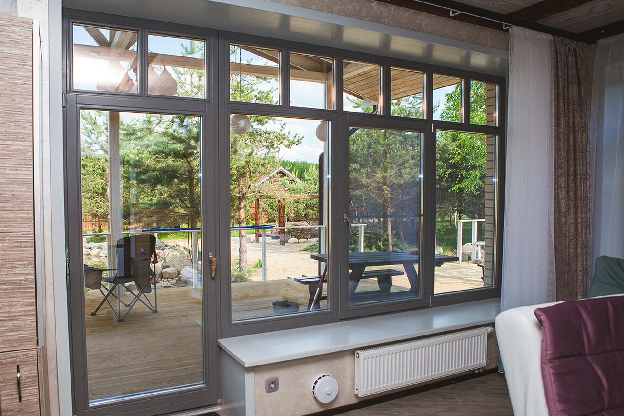 Важно учитывать светопроход. Небольшое окно не стоит чрезмерно дробить — каждая секция уменьшает количество света. Для панорамных форматов чаще выбирают редкий шаг или конструктивный переплет, который обеспечивает жёсткость и сохраняет гармонию пропорций.